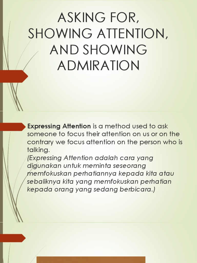Expressing attention adalah cara yang digunakan untuk meminta seseorang memfokuskan perhatiannya kepada kita atau sebaliknya kita yang memfokuskan perhatian kepada orang yang sedang berbicara. Giving attention atau memberi perhatian adalah ungkapan yang digunakan untuk memberikan perhatian/respon. Giving attention/memberi perhatian adalah ungkapan yang digunakan untuk memberikan perhatian/respon. Perhatian adalah tindakan atau kemampuan menghadirkan,. Excuse me sir, could i interrupt? Can i get the attention. We can use the following expressions to ask for someone's attention, except. Asking attention/meminta perhatian adalah ungkapan yang digunakan untuk meminta perhatian dari seseorang. Asking and giving attention adalah pernyataan untuk meminta dan memberi perhatian dalam bahasa inggris. 2 i understand about text structure of asking and giving attention expressions 3 i understand about language feature of asking and giving attention expressions 4 i can arrange the sentences of asking and giving attention expression to be a good dialogue.