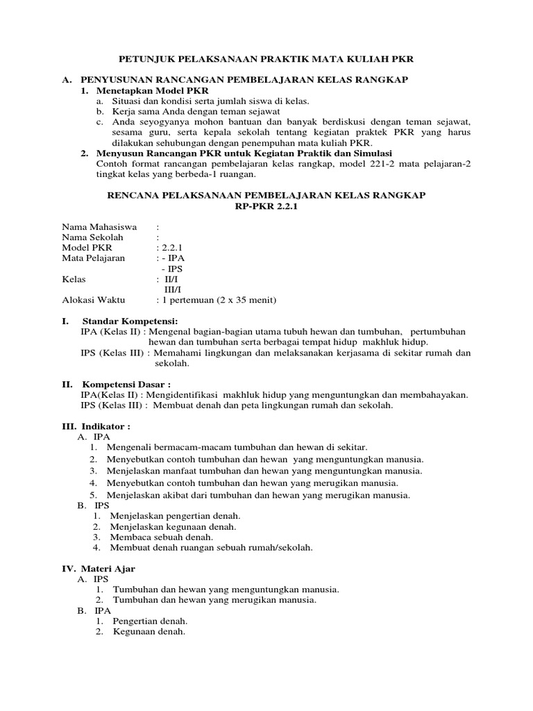 Amatilah dengan cermat pembelajaran yang sedang berlangsung 2. Mengembangkan & mengorganisasikan materi, media pembelajaran, dan sumber belajar 2.1. Yang bisa digunakan untuk melengkapi administarsi guru yang dapat di unduh secara gratis dengan menekan tombol download. Itulah yang dapat kami bagikan terkait contoh rpp pkr rpp kelas rangkap model 211 kelas 1 dan 2. Rpp pkr model 221 ut 1. 1.1.1 menyebutkan contoh lingkungan alam dan buatan di sekitar rumah. Rpp pembelajaran kelas rangkap model 211 kelas 2 dan 3 semester 1 rpp pembelajaran kelas rangkap model 222 tugas rpp pkr 221 sudarti contoh rpp kelas rangkap model 222 guru ilmu sosial doc contoh rpp pkr syafi i. 1 pertemuan (2 x 35 menit) i. Merencanakan skenario kegiatan pembelajaran kelas rangkap 3.1. View apkg 2 revisi.doc from english english co at universitas terbuka.