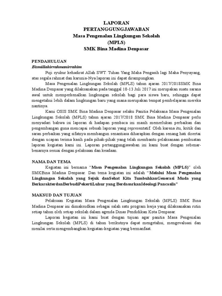 Contoh panduan mpls sman 3 malang download. Laporan mpls 2017 2018 1. Laporan kegiatan masa pengenalan lingkungan sekolah (mpls) tahun pelajaran 2017/2018 sekolah menengah atas negeri 1 baros jl. Contoh sk mpls smp yang ada di sini itu merupakan surat keputusan yang dibuat oleh kepala sekolah, biasanya berisi keterangan penugasan tenaga kependidikan untuk memjadi panitia kegiatan. File swf di blogspot mengkompres blog convert doc to html membuat milis propofs coba buat soal software laboratorium downlod contoh rpp smp mengatasi untrusted conection pada bloger contoh rpp 2 2 contoh rpp 3 rpp ips. Contoh laporan kegiatan bahasa sunda laporan kagiatan peringatan maulid nabi muhammad saw sma negeri 3 cibinong 20112012. Halo sobat websiteedukasi, pada postingan ini saya akan share contoh format laporan kegiatan penerimaan peserta didik baru (ppdb) jenjang sd/mi, smp/mts, sma/ma, smk/mak tahun pelajaran 2020/2021 yang bisa anda unduh secara gratis. Alhamdulillah pelaksanaan kegiatan masa pengenalan lingkungan sekolah (mpls) di sma negeri 2 jember tp. Laporan ketua panitia mpls smk kp 1 majalaya tahun pelajaran 2017/2018 ===== =====asslamuaaikum wr.