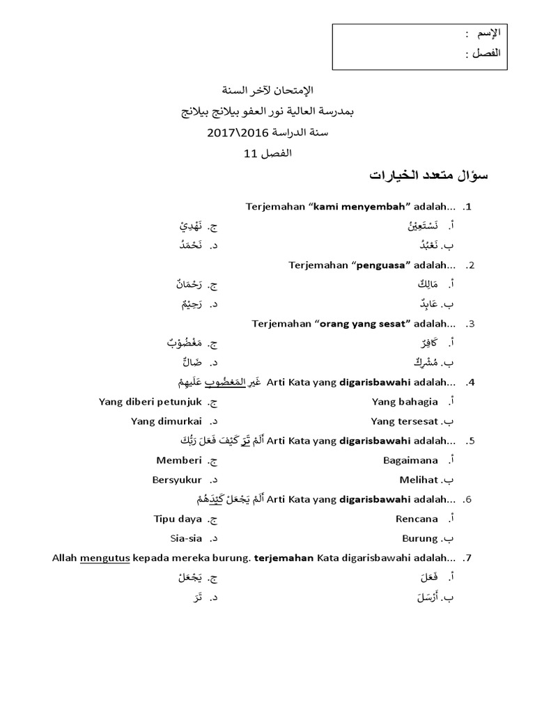 Soal bahasa arab kelas 7 ini sudah. Soal uas bahasa arab kelas 7 semester 1 kurikulum 2013 dan kunci jawabannya tahun 2018, dalam kesempatan ini akan membagikan soal uas terbaru khususnya mapel bahasa arab mts kelas 7. Dicariguru.com kembali membagikan kelengkapan perangkat evaluasi berupa download soal uas bahasa arab kelas 10 semester 1 k13 revisi 2018 dan kunci jawaban. Download soal uas bahasa arab kelas 10 semester 1 k13 revisi 2018. Berikut ini adalah 41 soal uas bahasa arab kelas i sd mi ganjil 2020 2021 2022 png yang merupakan kumpulan file dari berbagi sumber download tentang soal ksm bahasa. Sebagaimana diketahui, pada tahun pelajaran ini untuk kali pertama kma nomor 183 tahun 2019 tentang kurikulum pendidikan agama islam (pai) dan bahasa arab pada madrasah di berlakukan. Ulangan akhir semester (uas) atau penilaian akhir semester (pas) merupakan salah satu bentuk penilaian hasil belajar dimana materi soal diambilkan dari materi pelajaran dalam satu semester. Perencanaan pembelajaran bahasa arab* lihat soal: Bahasa arab mi kelas 4.